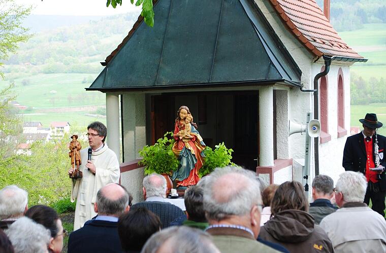 Für viele Riedenberger ist der Mai nicht nur wegen der erwachenden Natur etwas besonderes, sondern auch wegen der Maiandachten an ihrem "Kapelli", das auf einem Basaltfelsen hoch über der Rhöngemeinde steht und zum Wahrzeichen des Ortes geworden ist. Am Sonntagabend fanden sich zahlreiche Riedenberger zusammen mit den Musikanten der Rhöner Trachtenkapelle zur ersten Maiandacht auf dem Vorplatz der Kapelle ein. Die Andacht war auch Anlass, die neu restaurierte Statue des Hl. Wendelinus zu segnen und an ihren angestammten Platz in einer Grotte in der Basaltfelswand zu bringen.