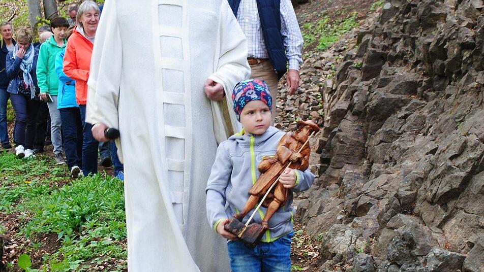 Die Riedenberger stiegen vom Kapelli zur Steinwand hinab, um die restaurierte Statue wieder an Ort und Stelle zu bringen.
