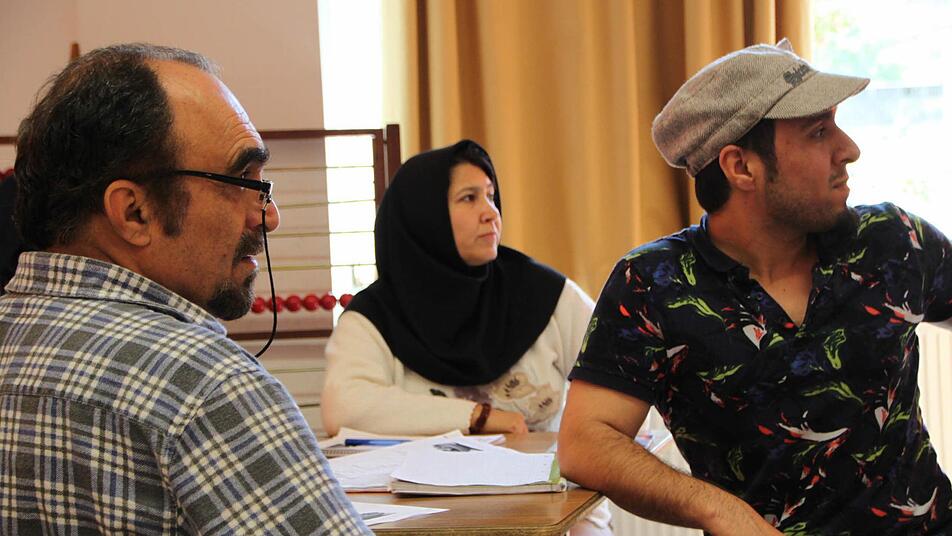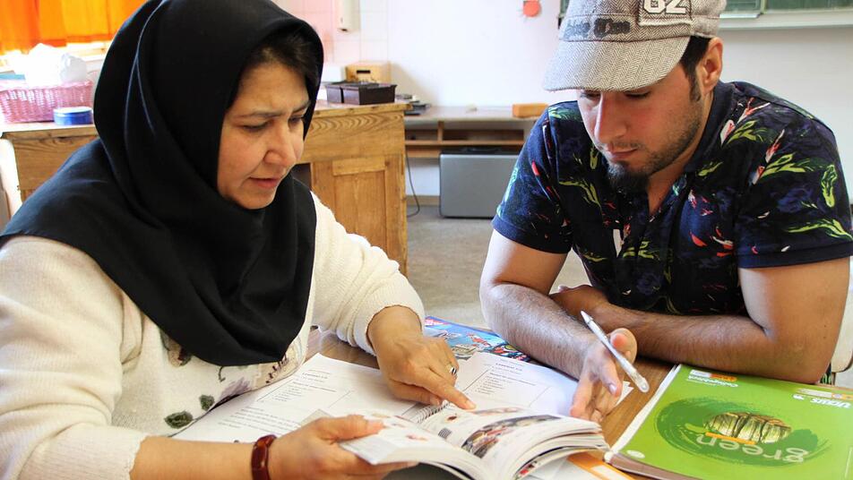 30 Asylbewerber leben aktuell in der Unterkunft, davon 14 Kinder. Es sind hauptsächlich Syrer, zwei afghanische Familien gehören ebenfalls dazu. Erst im Mai wurde über einige Anträge entschieden: Fast die Hälfte der Flüchtlinge im Haus darf nun ausziehen und den Integrationskurs in Bad Brückenau besuchen, berichtet Lucia Schmitt vom Caritasverband für den Landkreis Bad Kissingen. Für die, die noch warten, gibt es den Deutschunterricht in der Grundschule. "Schneiden", sagt Bernhard Schmitt und hält ein Bild hoch, das eine Kiwi und ein Messer zeigt. Marwa Alali aus Syrien steht auf und befestigt das Blatt an der Tafel.