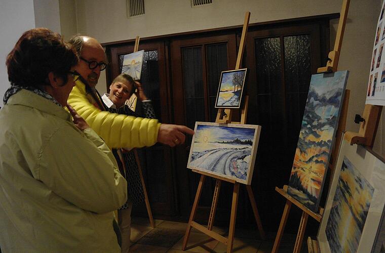 Pfarrer Armin Haas dankte Ludger Hinse für seine Kreativität, die auf die 16 Malerinnen um Mathilde Knuchel vom Malkreis "Palette" bereits im Vorfeld abgefärbt zu haben scheint. Im Anschluss an den Gottesdienst wurde die Ausstellung eröffnet. Einige Wochen lang hatten sich die Künstlerinnen Gedanken zu "Spuren zum Licht" gemacht, ein nicht ganz einfaches Thema, nicht nur für die "Neue" im Malkreis. Maria Rottmann "hatte lange daran zu knabbern", wie das Licht durch die richtige Maltechnik umgesetzt werden konnte. Nach Verbesserungsvorschlägen durch Mathilde Knuchel "wachsen die Äste des Baums nun zum Licht", jetzt stimmt die Perspektive und auch die Malerin kann sich mit ihrem Bild identifizieren. Aber auch für Hilde Kessler, die schon einige Zeit länger dabei ist, war es "ein langer gedanklicher Prozess". Kein Regenbogen sollte es sein, sie entschied sich für die Darstellung eines Kreuzes, das aus vielen verschiedenen Bausteinen zusammengesetzt ist. Sowohl dunkle, als auch helle Punkte symbolisieren die Bausteine des Lebens, aus denen das Kreuz gebildet wird.