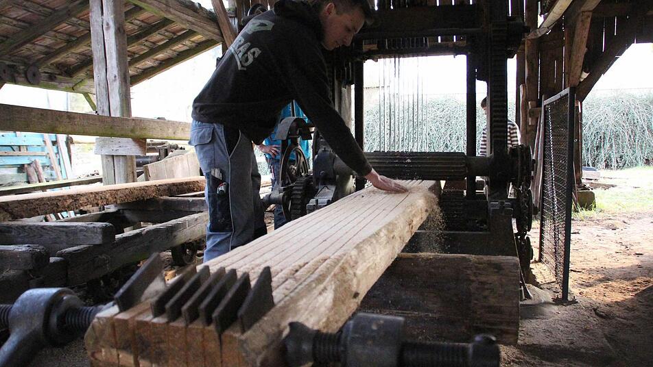 Der Dieselmotor schnauft. 20 PS keuchen schwarze Rauchwolken aus dem Abgasrohr. Es riecht nach Öl und Holzspähnen. Um die Ecke walzt das Mühlenrad an der immer gleichen Stelle das Wasser in dem kleinen Zulauf. Rad und Motor sorgen dafür, dass sich elf Sägeblätter durch eine Holzbohle fressen. Das "Heiligtum vom Opa" lärmt. Früher hat die Anlage das täglich gemacht und Arbeitslohn eingebracht. Heute, 50 Jahre später, sorgt Oliver Schwenzer dafür, dass die Anlage noch ab und zu im Mittelpunkt steht. So wie am Deutschen Mühlentag am Pfingstmontag.
