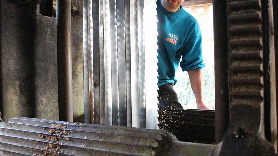 Stefan Leitsch hat im normalen Berufsleben als Fachinformatiker nicht viel mit Maschinenöl zu tun. Das Schrauber-Fieber hat er von seinem Vater. "Alte Technik fasziniert mich", sagt er. So wie das mächtige Vollgatter auf dem Grundstück seines Schwiegervaters, das viermal so alt ist wie er. Als Oliver Schwenzer mal wieder Holz gesägt hat, kam er dazu und hat sich seitdem nach und nach eingearbeitet. Mittlerweile hat er viele Tipps aus dem Internet zusammen getragen. Ihm liegt etwas am Erbe früherer Generationen: "Es wäre schade, wenn man irgendwann nicht mehr sehen könnte, wie so etwas funktioniert hat und die Leute früher ihr Holz bekommen haben, um ihr Haus zu bauen."