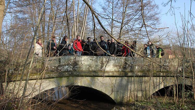 Weiter geht's für die Gruppe am Ufer der Sinn entlang in Richtung Eckarts. Oswald Türbl vom Bund Naturschutz und Robert Hildmann, Leiter der Kurgärtnerei im Staatsbad, führen die Teilnehmer durch abwegiges Gelände, vorbei am mächtigen Biberbau durch ein Gebiet, das bewusst der Natur zurückgegeben wurde, damit sich bedrohte Arten wie Eisvogel, Wasseramsel oder Schwarzstorch wieder ansiedeln. "Das Gebiet dient auch dem Schutz vor Hochwasser", erklärt Hildmann.