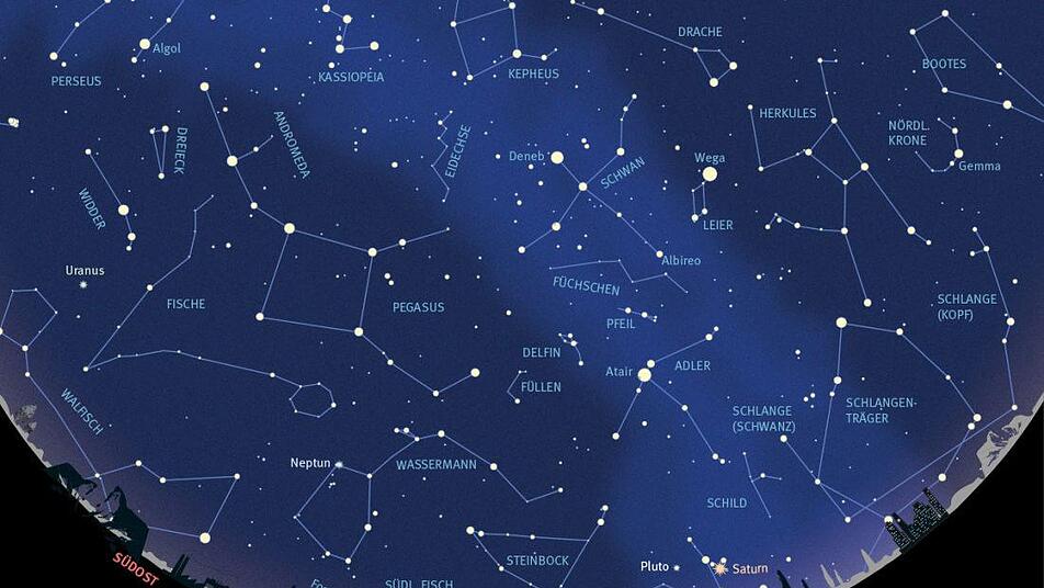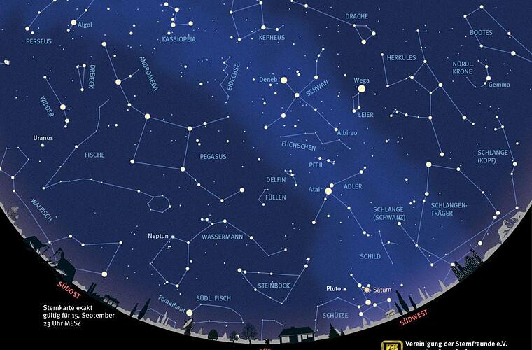 Viel näher sind uns die Planeten Jupiter und Saturn, die abends den Südhimmel durchziehen. Etwa denselben Weg nimmt der Mond (Vollmond 14.9., Neumond 28.9.), dessen Sichelphasen im Fernglas viel Freude machen können. Da zeigen sich, besser noch als bei Vollmond, Details wie Kraterränder, Gebirge, Gräben und dunkle Tiefebenen, über die einst Lava floss. Auch ein paar Sternschnuppen könnten über den Monat hinweg von Nordosten her hie und da aufblitzen.