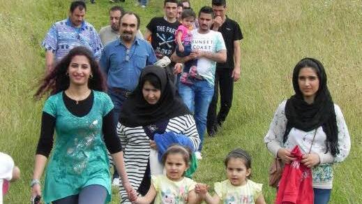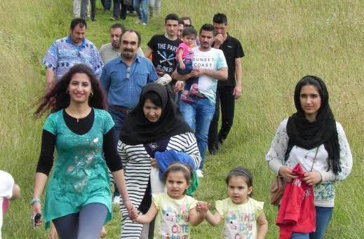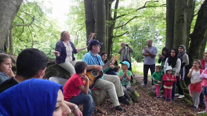 Ehrenamtliche Helfer aus den drei Ortsteilen, Mitglieder der "Eine Welt Gruppe des oberen Sinngrundes" sowie Asylbewerber aus Afghanistan und Syrien beschnupperten sich und kamen lebhaft miteinander ins Gespräch. Der Nachmittag endete in einer frohen Runde mit Gitarre, deutschen und englischen Volks- und Kinderliedern, Klatschen und Tanzen und natürlich auf dem Spielplatz am Berghaus.