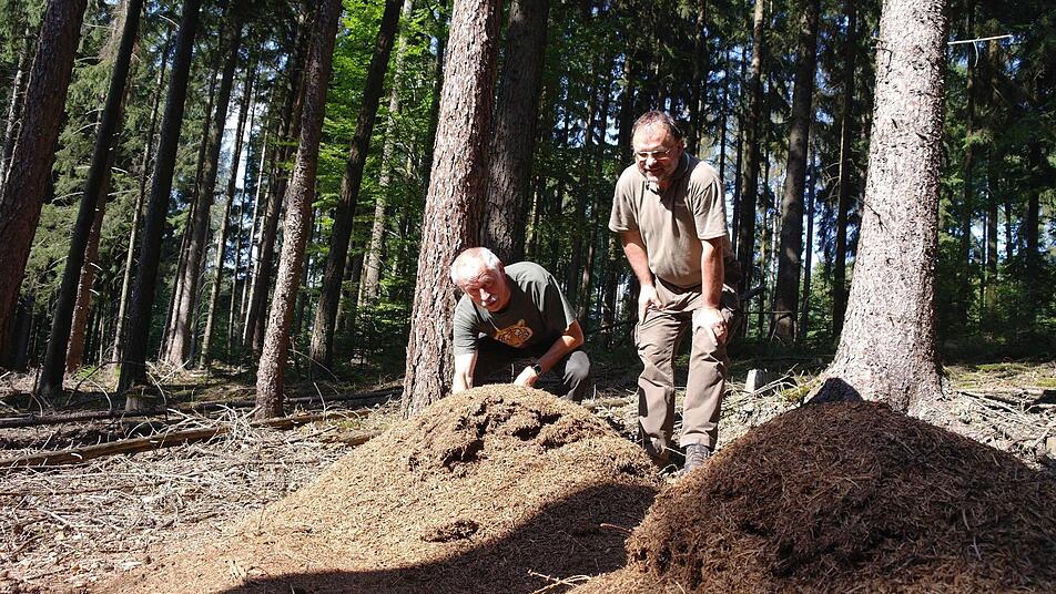 Oswald Türbl, ehemaliger Biologielehrer und Mitglied im Bund Naturschutz, interessiert sich für die hohe Ameisendichte. "Bei mir stehen da vielleicht ein oder zwei Ameisenhügel, aber diese Anzahl ist schon was Besonderes", sagt er erstaunt.