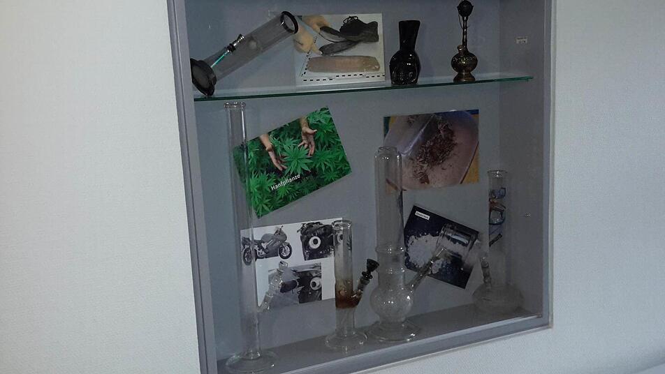 Die Idee für die Schaukästen mit wechselnden Inhalten stammt aus dem 1998, als im damals neuen Polizeidomizil ein "Tag der offenen Tür" stattfand. Jetzt wurde die Präsentation der Asservate wieder einmal überarbeitet und auf den neuesten Stand gebracht. Diese Aufgabe hatten Polizeihauptmeister Florian Leimbach und Polizeioberwachtmeister Christian Mehler übernommen. Der 23-jährige Praktikant kommt aus dem hessischen Eichenzell und bildet sich in Bad Brückenau fort. "Sichergestellte Gegenstände dürfen nach Absprache mit der Staatsanwaltschaft zu Schau- und Ausbildungszwecken bei der örtlichen Polizei verbleiben", klärt Fries über das Prozedere auf.