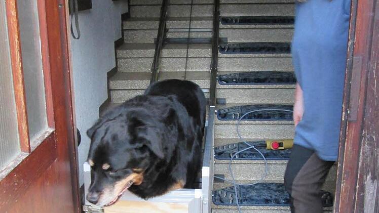 Damit ihr Rottweiler Leonie auch im gesegneten Alter kein Hundeleben durchleiden muss, hatte die Detterer Familie Böhm eine Idee, wie ihre Hündin die Treppe trotz Krankheit bewältigen kann. Mit viel Tüftelei setzte sie diese um.