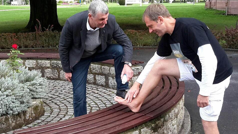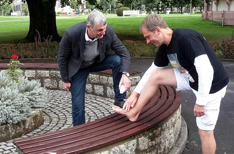 Der Arzt Frank Jester ist ohne Schuhe und ohne Socken einen Monat unterwegs, um ganz Deutschland zu durchqueren. Er machte auf dem Weg zum Bodensee Station in Bad Brückenau. 2. Bürgermeister Jürgen Pfister empfing ihn.