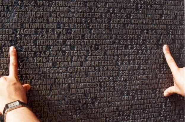 "Nach dem beeindruckenden Besuch der riesigen Gedenkstätte in Verdun waren wir schon auf der Rückfahrt, als wir an dem Schild des Soldatenfriedhofs von Hautecourt vorbeikamen!" Einen letzten Versuch starteten die beiden noch, wieder liefen sie durch den Friedhof. Dann - im Hinausgehen - fiel Liebs Blick auf eine Wand, in die ebenfalls unzählige Namen von Kriegsopfern für ein Sammelgrab eingraviert waren. "Erfreulicherweise diesmal alphabetisch", erinnert er sich. "Ich traute meinen Augen kaum", war er überrascht und glücklich zugleich, doch noch eine letzte Spur dieses jungen Soldaten gefunden zu haben. Nun liegt die Fotografie dieser Tafel in seinem Archiv neben dem Bierkrug, der Taschenuhr und dem Sterbebildchen, das später in Oberbach für den Gefallenen gedruckt und verteilt worden war. Jürgen Lieb interessiert sich sehr für die Geschehnisse der beiden Weltkriege: "Die Auswirkungen haben jedes einzelne Menschenleben auf immer geprägt!"