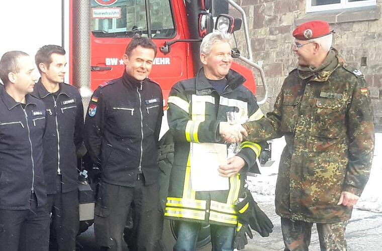 Bei einer kleinen Feierstunde im Kreise der Feuerwehrkameraden würdigte der Kommandeur der Bereichstruppenübungsplatz-Kommandantur Süd, Oberstleutnant Roman Jähnel, den zukünftigen Ruheständler als "Mann des alten Schlages". Mai sei in vielerlei Hinsicht eine tatkräftige Stütze gewesen. Der Feuerwehrmann habe einfach immer ohne Zögern sofort da mit angepackt, wo er gebraucht wurde. Auch bei den Kollegen erfreut sich der dreifache Familienvater großer Wertschätzung: "Seine Art kam bei allen immer sehr gut an".