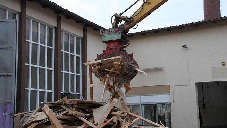 Mit Wucht gräbt sich die Schaufel in die Hauswand. Dann nimmt sie ein Stück Mauer zwischen ihre Zähne. Und noch ein Stück. Und noch eins. Da, wo lange Jahre die "Grasmühl'" stand, wird bald nur noch eine ebene Fläche zu sehen sein. Seit diesem Montag wird der Abriss der "Grasmühl" vorbereitet. Am heutigen Freitag beginnen die Bagger damit, das Gebäude abzutragen. Schon in zwei Wochen starten - wenn alles gut geht - an dieser Stelle die Tiefbauarbeiten für das neue Fachmarktzentrum.