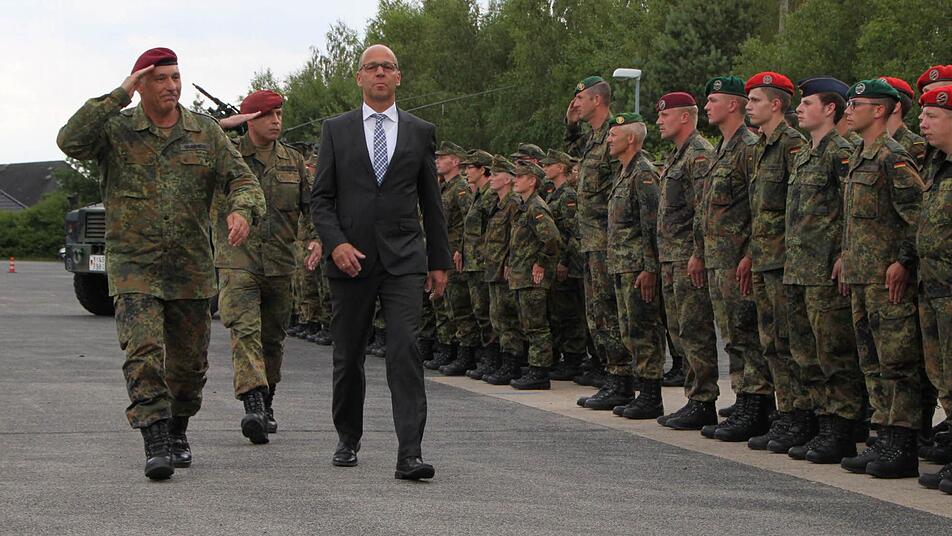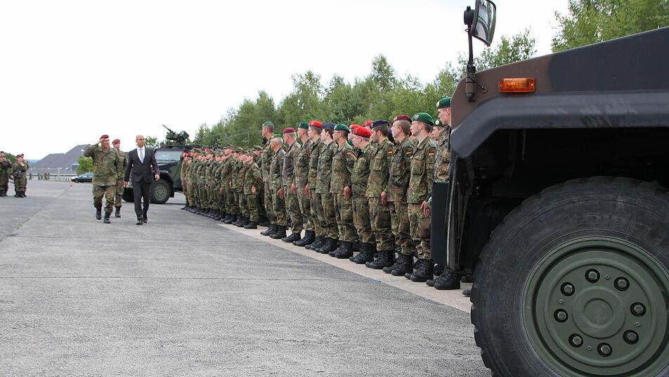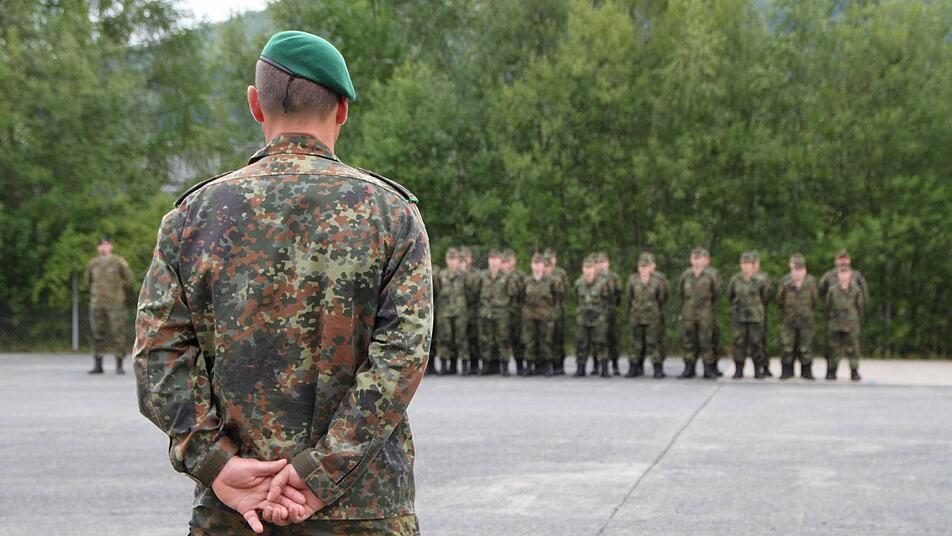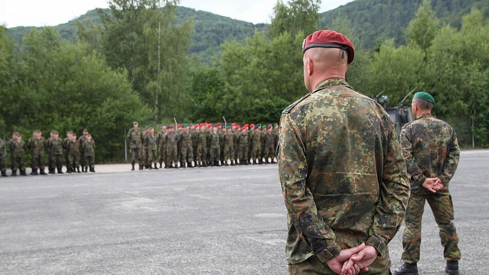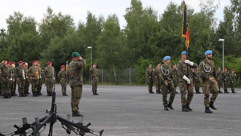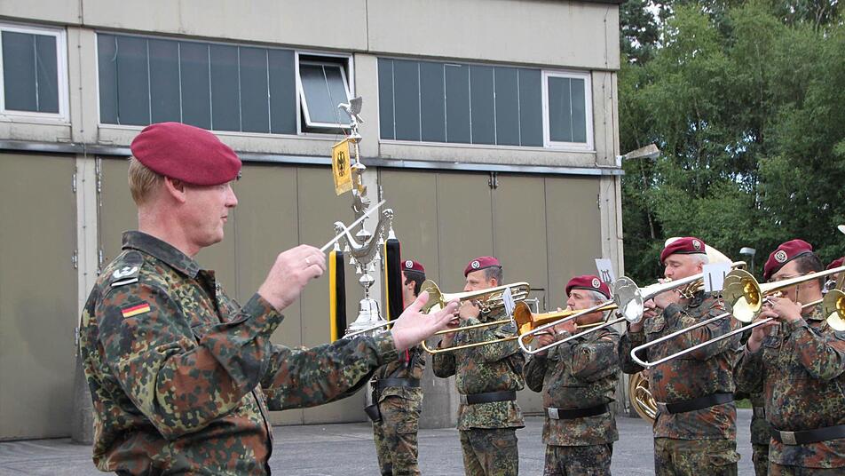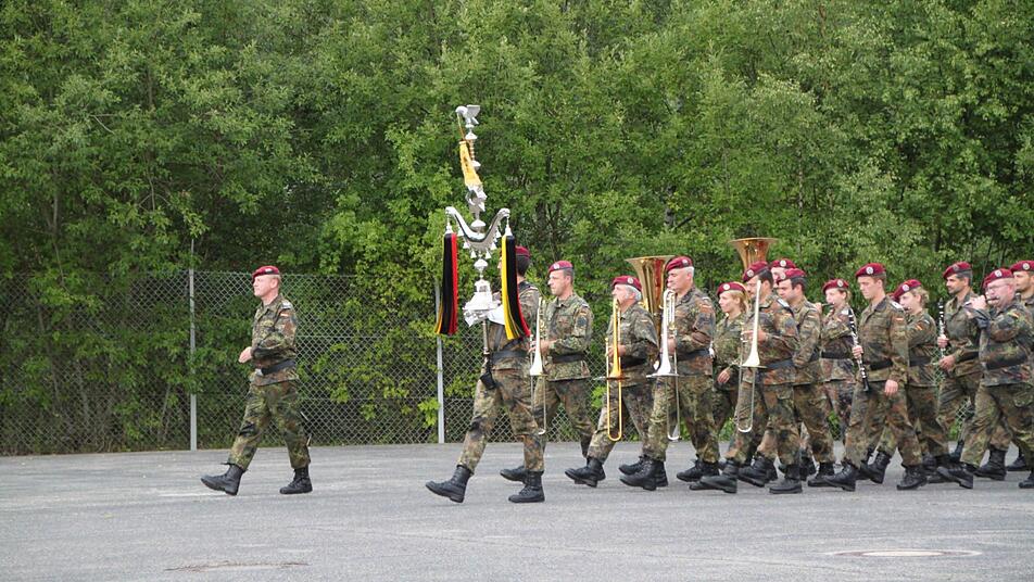 Stille liegt über dem Platz. "Das Heeresmusikkorps Veitshöchheim ist dafür bekannt, dass es auf die Minute pünktlich ist", wispert Nils-Alexander Simon, Medienstabsoffizier vom Ausbildungszentrum der Bundeswehr in Hammelburg. Und tatsächlich, Punkt 18 Uhr erklingt die Musik und das Korps zieht ein. Jetzt herrscht keine Stille mehr. "Grüß Gott!", schreit Roberto Otto über den Platz. "Grüß Gott, Herr Oberstleutnant", brüllt die Truppe zurück. "Leutnant, Leutnant, Leutnant", werfen die Berge den Schall zurück. Stille.