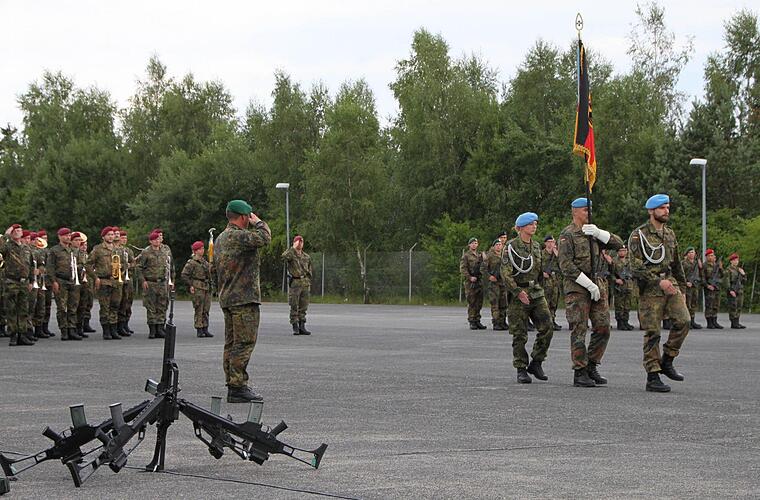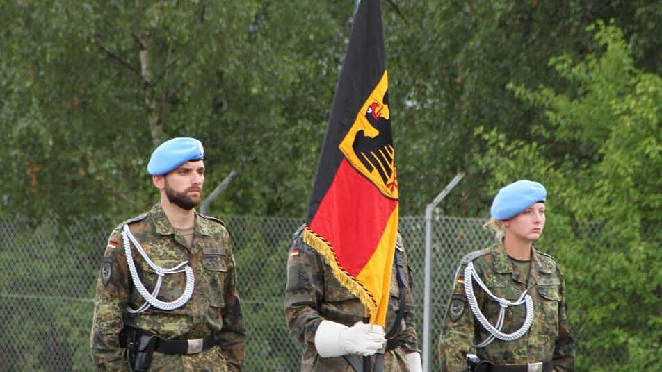 Dann treten drei Soldaten mit hellblauen Mützen vor. Das ist die Farbe des Ausbildungszentrums. Sie tragen die Truppenfahne in die Platzmitte. Vier Leute - darunter auch Finni Spieth - treten ebenfalls vor. "Ich gelobe", sagen sie. "Ich gelobe", antwortet die Truppe. Und dann legen sie das Gelöbnis ab, mit dem sie ihre Solidarität mit Deutschland und seinen Grundwerten zum Ausdruck bringen. Hymne. Abmarsch.