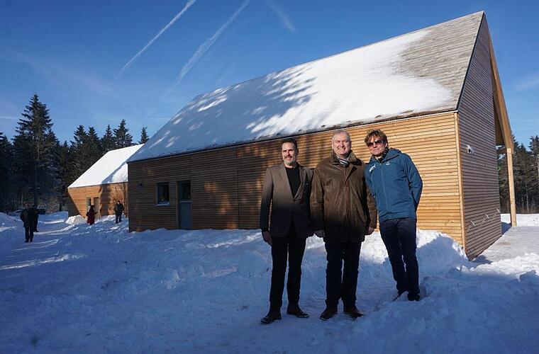 Bei der Teileröffnung des Feriendorfes auf der Wasserkuppe führen die  Investoren  Andreas Schubert (rechts) und Boris Kiauka (links)  Landrat Bernd  Woide über die Anlage. Foto: Marion Eckert