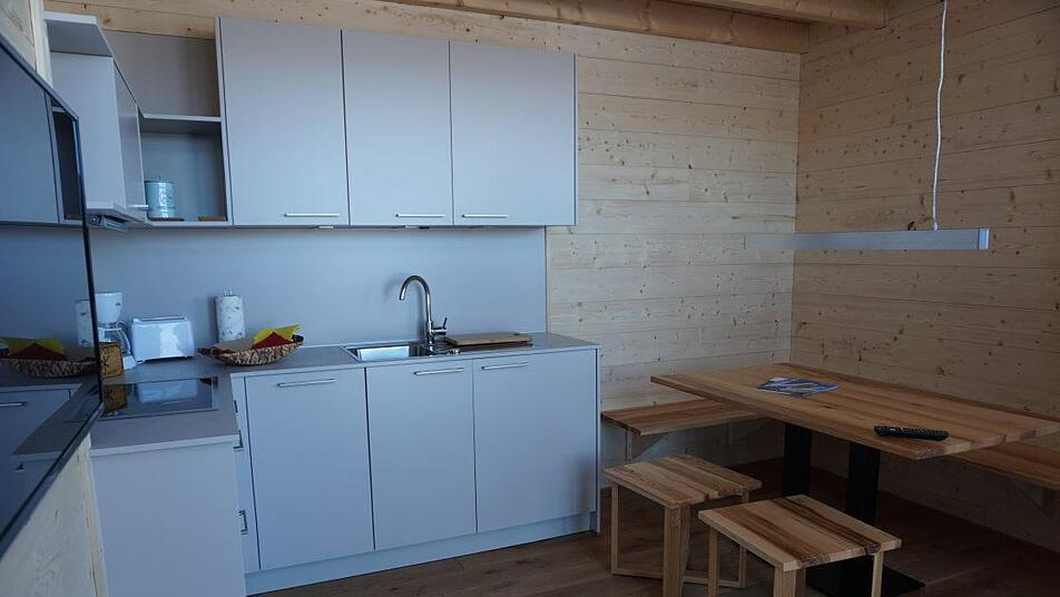Zeitgemäß und modern eingerichtet sind die neuen Ferienhäuser auf der  Wasserkuppe, hier die Küche. Foto: Marion Eckert