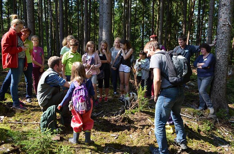 Anhand von Fährten und Spuren konnten die Kinder durch Anleitung des Försters die Arten der heimischen Wildtiere kennenlernen Die Unterscheidung von Müll und der Einsatz von waldbaulichen Maßnahmen wie Verbissschutz brachte Michael Sautter den Kindern durch inszenierte Beispiele näher.