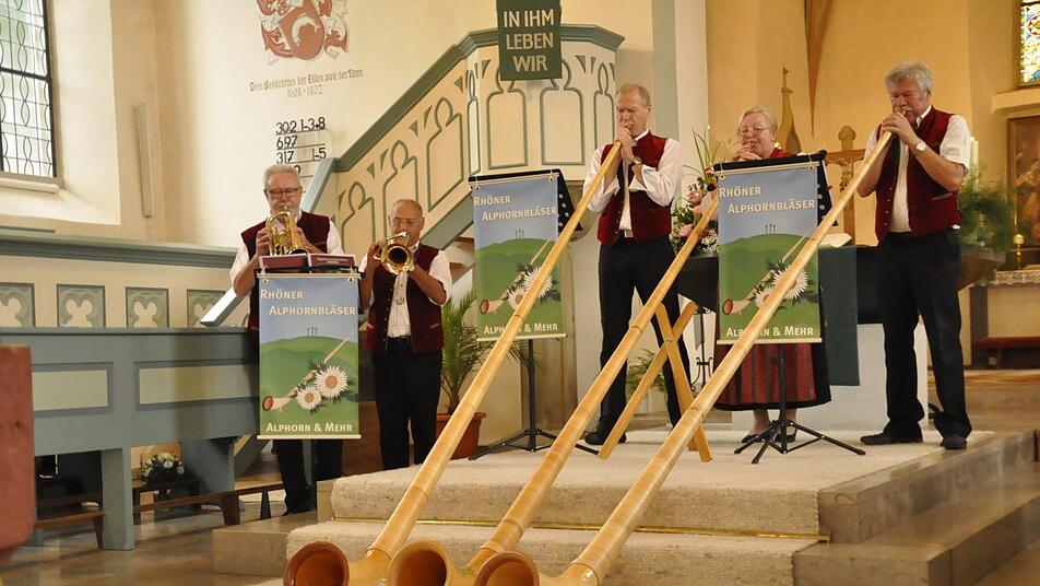 Pfarrer Carsten Friedel, der am nächsten Tag aus der Kirchengemeinde verabschiedet wurde, leitete den Gottesdienst. Er sagte: "Die Alphornmesse ist für mich ein besonderes Abschiedsgeschenk. Es ist eine andere Form der Messe als üblich." Schon der Einstieg mit dem Gloria durch die Alphornbläser (Ingrid Schubert, Wolfgang, Fella und Reiner Morshäuser) war ein fulminanter Auftakt. Danach folgte ein gemeinsames Zwischenspiel zwischen Alphörnern und Orgel (Gerald Benisch). Bei dem melancholischen Lied "Nimm dir Zeit, wenn ein Lied erklingt" der Sängerfreunde aus Burkardroth (Elisabeth Henneberger, Wilhelm Schubert, Sigrid und Christoph Vierheilig, Monika und Emil Müller) begleiteten Ingrid Schubert auf der Zither und Elisabeth Henneberger auf der Gitarre. Dazwischen erklangen Lieder, bei denen die Gemeinde mitsingen konnte und die Alphörner Vor-, Zwischen-, oder Nachspiel intonierten. Bei einigen Melodien rundeten Waldemar Danz und Ludwig Knüttel mit ihren Flügelhörnern den weichen Klang der Alphörner ab. Stimmungsvolle Gebete und Texte rezitierten Sigrid und Christoph Vierheilig.