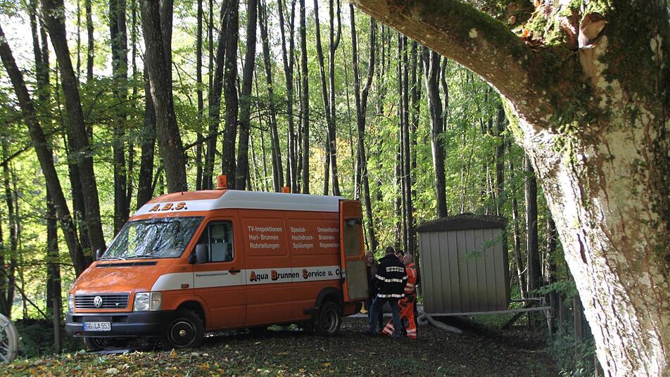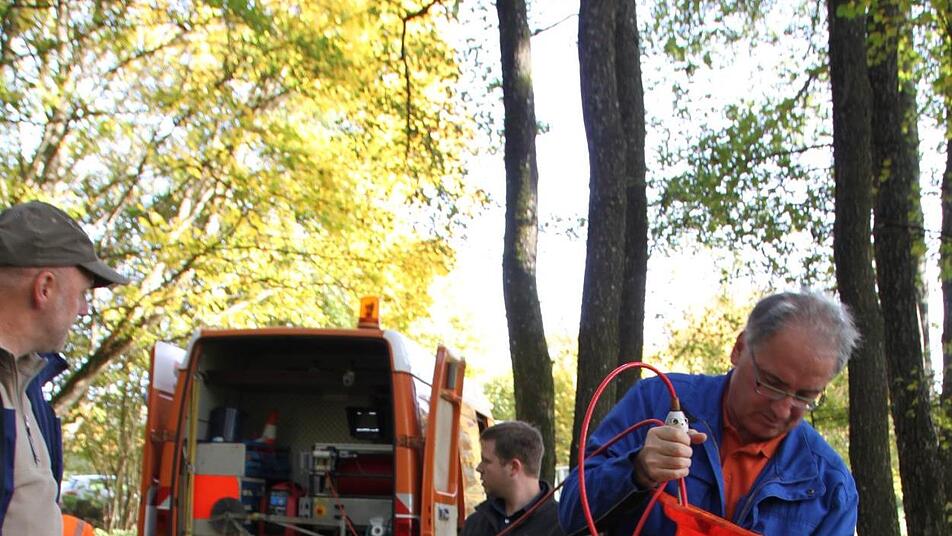Die Fachleute der Aqua Brunnen Service Regenerierungstechnik GmbH aus Eltmann setzen eine Kamera in das Rohr, aus dem das Wasser sprudelt. Ferngesteuert fährt sie gegen den Wasserstrom an, der mit etwa 6 bis 6,5 Litern pro Sekunde aus dem Rohr schießt. Die ersten Bilder erscheinen auf dem Bildschirm, doch nach knapp einem Meter ist erst einmal Schluss. Das Rohr ist durch einen Zwischenraum unterbrochen. "Ein Absetzschacht", vermutet Wasserwart Werner Schneider.