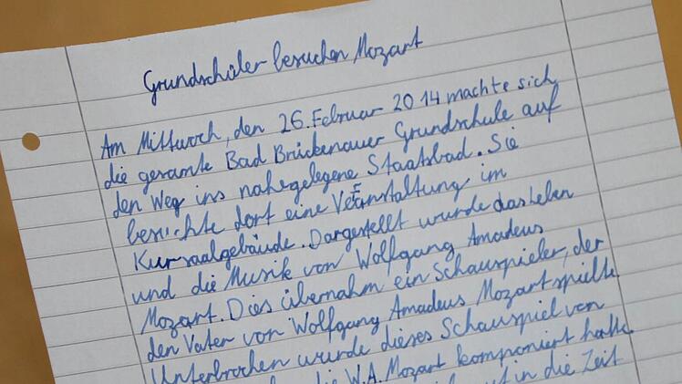 "Am Mi dem 26.2.2014 ging die Grundschule BRK in den Königludwigsal in Staatzbad zu einen forspiel fon den Leben Mozart" "mit dem Bairischen Camerorchester". "Die ganze Grundschule Bad Brückenaus sha sich das Theaterstück über Morzad an". "Im historischen und mit Perücke auf dem Kopf erzählte der Dirigent, alias Leobold Mozard die Geschichte von seinem begabten Sohn Wolfgang."