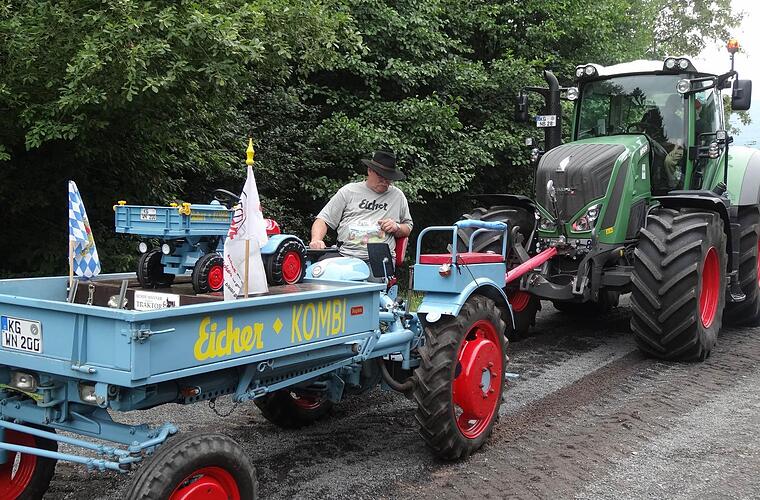 Den absoluten Hingucker bot Wolfgang Nickolai (Sinntal Oberzell) mit seinem 56 Jahre alten Eicher-Kombi. Mit der 20 PS starken Maschine zog er den Fendt Vario 828, der 280 PS und zehn Tonnen Eigengewicht hat, locker über die gesamte Strecke. "Ich hätte nicht gedacht, dass ich so weit komme", freute er sich über diese tolle Leistung seines Eicher-Kombi. Ein Kindermodell des Eicher-Kombi, natürlich in der passenden Farbe, hatte er auf der Ladefläche mit dabei: "Den habe ich umlackiert und die Aufkleber besorgt." Der Sonntagvormittag begann mit einem ökumenischen Gottesdienst.Die Kollekte wurde zum Teil für die Ausgestaltung der neuen Kapelle in Oberwildflecken und die Sanierung der Orgel in der evangelischen Kirche in Wildflecken