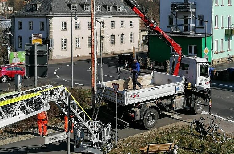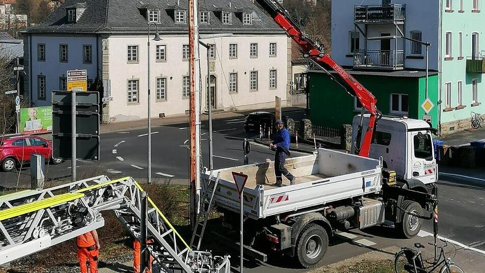 Die Aktion dauerte kaum länger als eine halbe Stunde. Mitarbeiter der Stadtwerke und des Bauhofs rückten am Donnerstagvormittag mit einem LKW-Kran an der Kreuzung der Hammelburger Straße mit dem Bahnradweg an. Sie verhakten die seit vielen Jahren nicht mehr bewegten, senkrecht stehenden Schrankenbäume mit dem Ausleger. Dann flexten sie das Metall oberhalb des Heb-und Senkmechanismus ab. Anschließend brachten die Arbeiter die Schlagbäume zum Bauhof, wo sie - weiter zerlegt - auf den Schrotthändler warten.