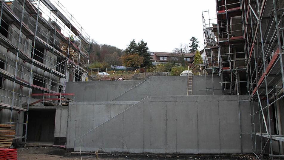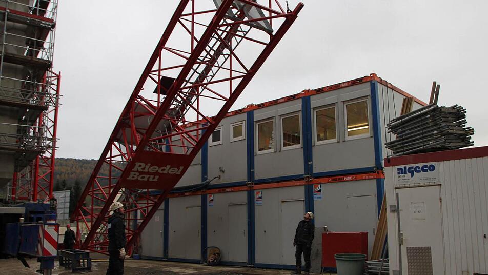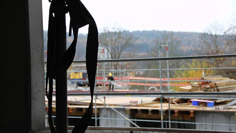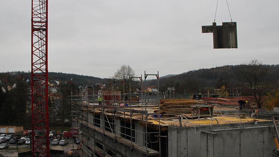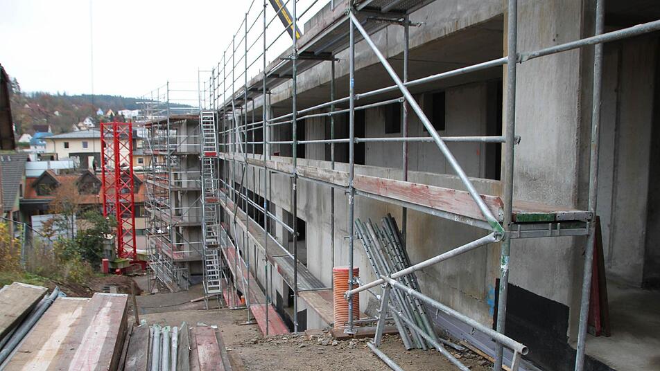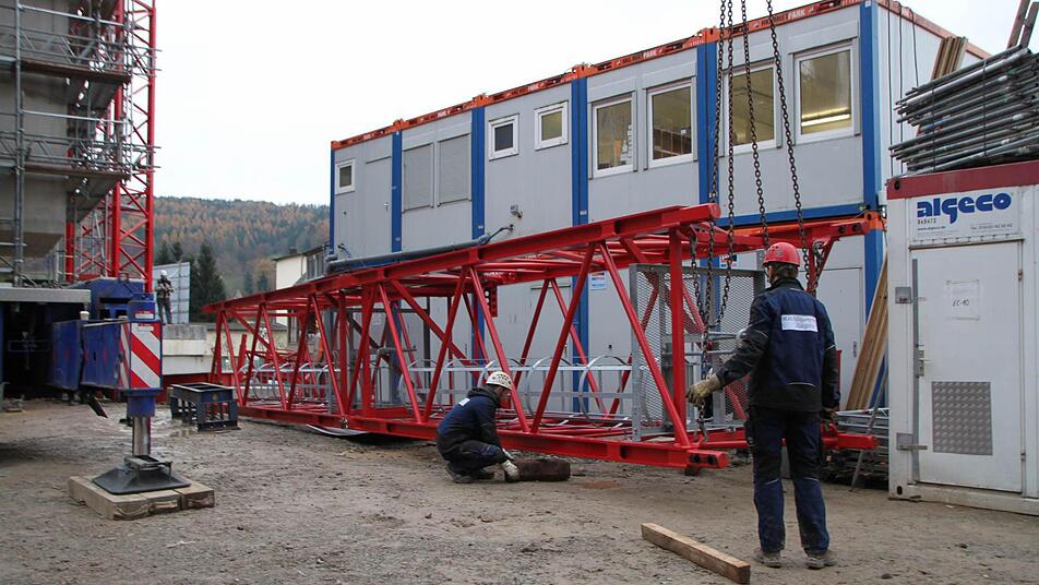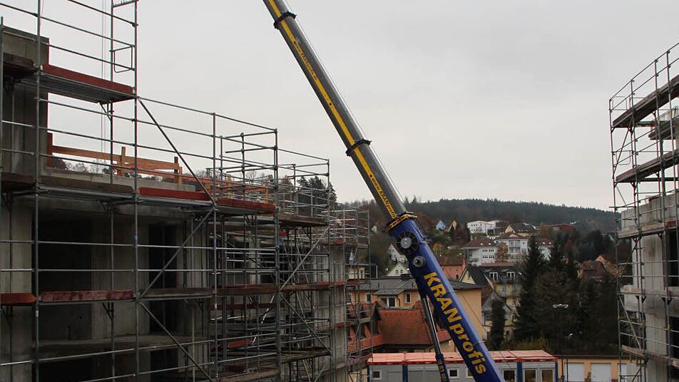 Die Schritte von Andreas Ollertz hallen von den kahlen Betonwänden. Der Boden ist feucht, hier und dort liegen Reste von Wärmedämmung oder einzelne Holzlatten. "Wir liegen gut in der Zeit", sagt Ollerzt. Sein gleichnamiges Architekturbüro macht die örtliche Bauleitung für den Planer KTP. Der Rohbau für das neue Haus Waldenfels ist fast fertig. Am Donnerstag wurde bereits der erste Kran abmontiert und weggefahren. Das Schauspiel zeigt, wie präzise die Bauleute arbeiten.