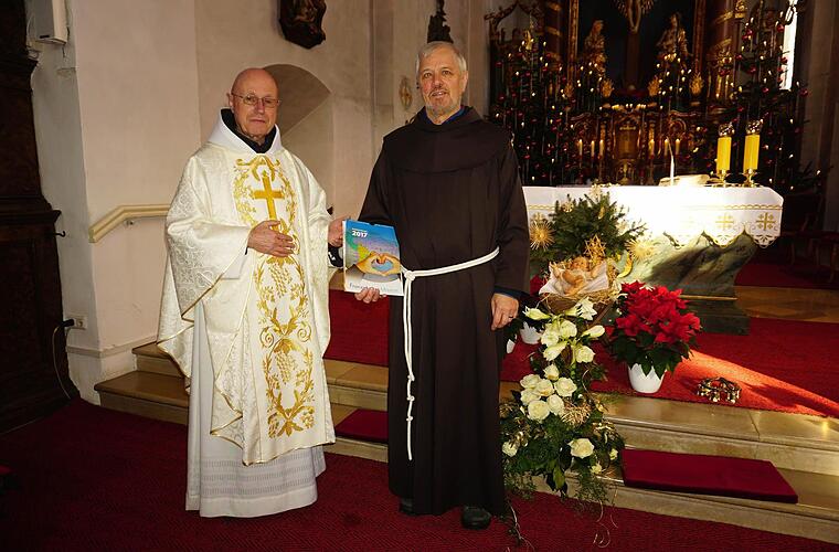 Um allen, die zu diesem Ergebnis beigetragen haben, zu danken, war Pater Alfons Schumacher, der Leiter die Franziskaner-Mission in München, zum Kreuzberg gekommen. Auch Pater Georg Andlinger, der momentan am Kreuzberg die Verantwortung trägt, dankte den Besuchern des Adventsmarkts, den Marktbeschickern und den Mitarbeitern der Klosterbetriebe, die mit großem Engagement am Aufbau und an der Durchführung des Adventsmarkts beteiligt waren.