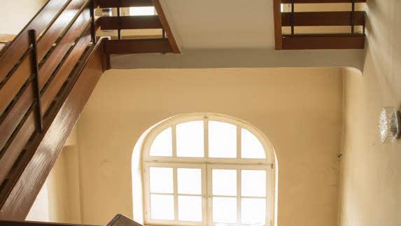 Die Aufkleber an der Glasscheibe erzählen von früher. "Kastrup Rejser" klebt neben "Forsby Buss AB" und "Reisebureau Dan-Express Kopenhagen". Darüber steht, aus einzelnen Buchstaben zusammengesetzt, schlicht das Wort R-e-z-e-p-t-i-o-n. Hinter der Glasscheibe geht's zu den Zimmern. Die Gänge sind leer, der Teppich im Treppenhaus ist lose, so dass man leicht stürzt. Im Keller: Gerümpel. Ein alter Staubsauger, Tüten, eine Tür. Wer sie öffnet, steht vor einer gemauerten Wand.