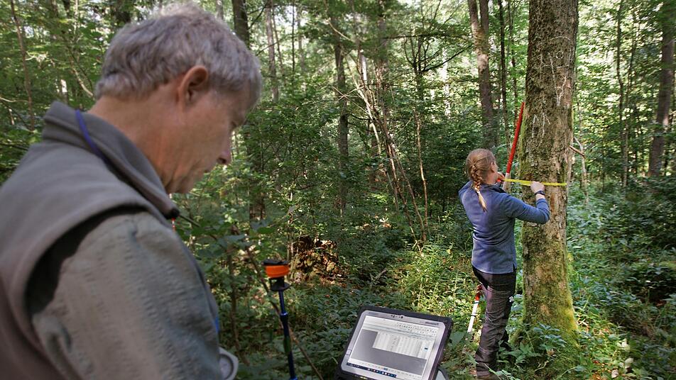 Joachim Eßlinger und Laura Winckelmann vom Bayerischen Landesamt für Wald- und Forstwirtschaft (LWF) tun das, weil sie einen klaren Auftrag haben. Und der heißt Bundeswaldinventur. Alle zehn Jahre wird im ganzen Land ermittelt, was an Bäumen im Wald steht. Art und Alter der Bäume wird unter anderem erfasst, aber auch Stammdurchmesser, Höhe und was an Verjüngung und Bodenvegetation da ist - insgesamt 150 Parameter.