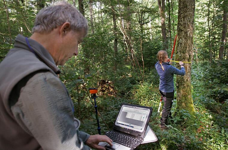 Am Fuße des Kreuzbergs, bei Oberwildflecken, gibt es im Moment zwei Menschen, die sich besonders für den Wald interessieren. Sie schlingen Maßbänder um Stämme, blicken mit seltsamen Geräten in Baumkronen, begutachten und vermessen bemooste, halb vermoderte Stümpfe. Die Daten tragen sie in ein Laptop ein.