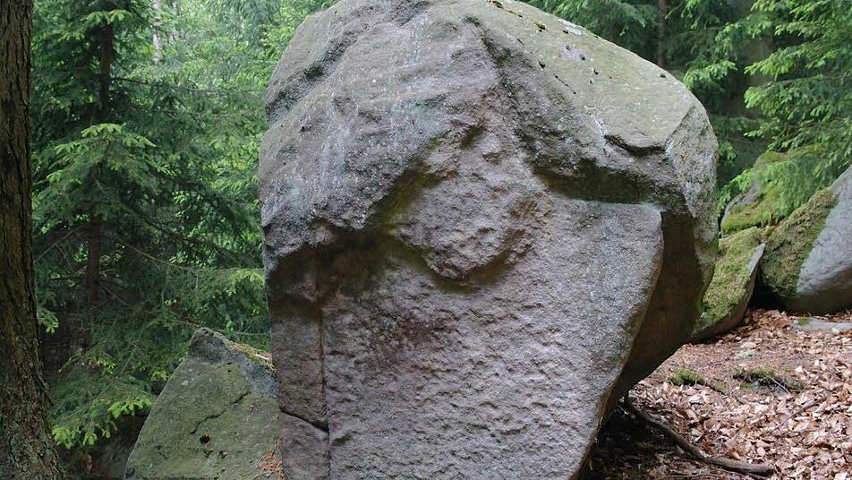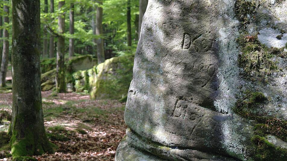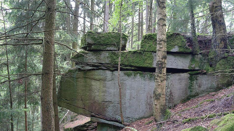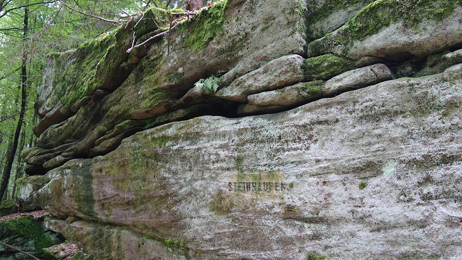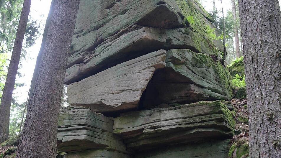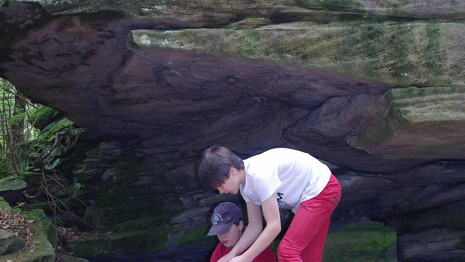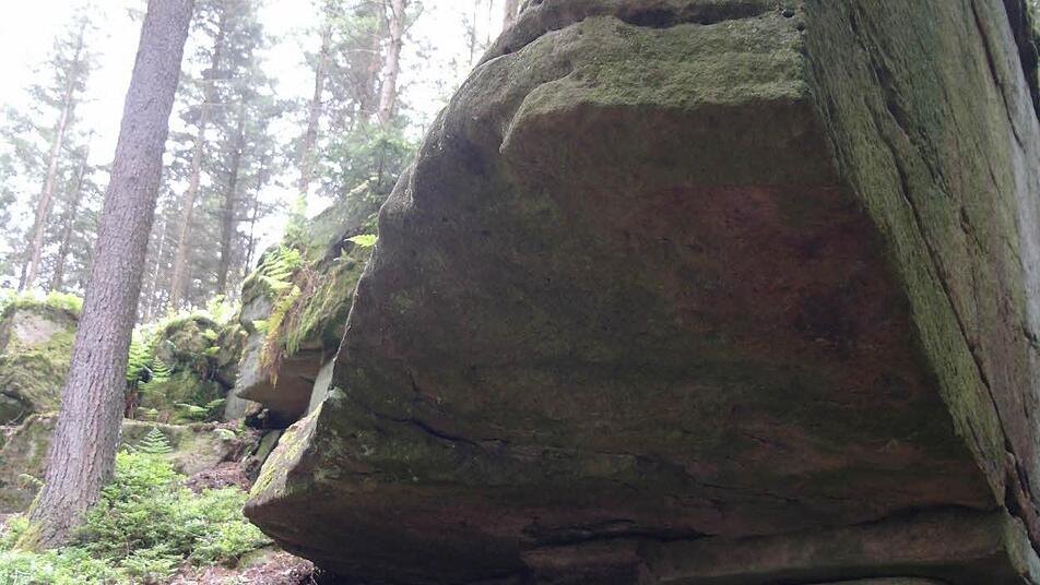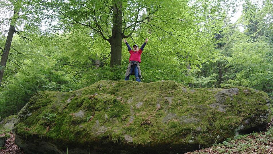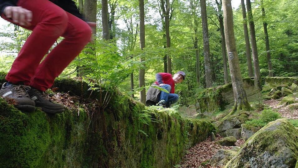 Ein Stückchen oberhalb vom Röderhof bei Riedenberg geben steinerne Vorboten schon einen Geschmack auf die Langen und Großen Steine. Je höher der Wanderer gelangt, umso größer und mächtiger werden die Zeugen millionenlanger Erdgeschichte. Dominik ist überrascht, "dass die schon so alt sind". Alt und mächtig - für Fabian "eine tolle Gelegenheit zu klettern".