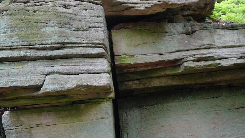 Durch den Wechsel von Wärme und Frost und dem damit verbundenen Quellen und Schrumpfen von tonigem Erdmaterial bewegen sich Hänge abwärts. Auch durch das sogenannte "Kammeis", das sich an feuchten Hängen bildet, wurden die Steine im 90 Grad-Winkel zur Neigung angehoben. Nach Abschmelzen des Eises rutschten diese talwärts. Durch all diese vielen und lange andauernden Einflüsse zerbrach das angehobene Sedimentgestein in größere und kleinere Brocken. Auf beiden Seiten des Disbachs erfolgte die gleiche Entwicklung, die Langen und Großen Steine sind quasi verwandt. Der Disbach wurde zum Schluss der Eiszeit noch zwischen die Monumente in den Grund eingegraben. "Die großen Steine am Hirschgraben liefern schöne Einblicke in das Schichtenpaket", schwärmt Ingo Queck . Da gibt es dickere und gröbere sowie feinere und tonigere Sandsteine. Letztere konnten von Wind und Wasser leichter erodiert werden.