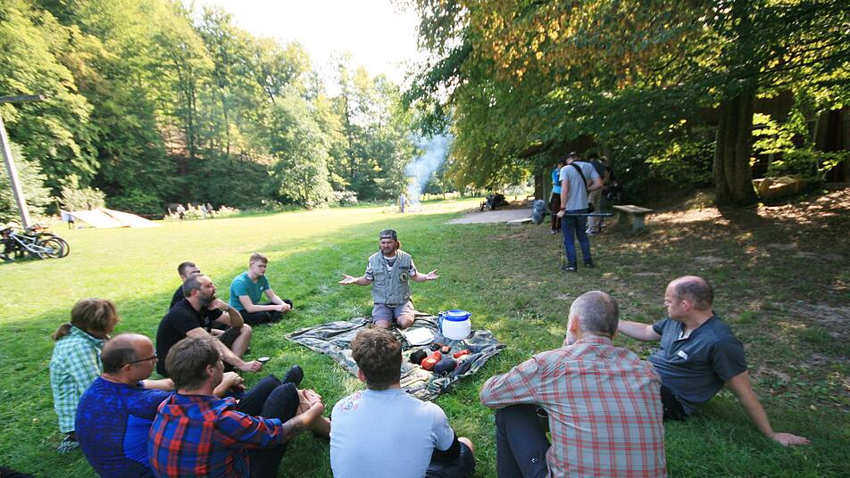 Das dreitägige Event zum 30-jährigen Bestehen fand im Camp  Detter am Ufer der Schondra statt. Die Survival-Begeisterten, die es sich zur Leidenschaft gemacht haben,  in und mit der Natur aktiv zu (über)leben, haben eigens zum Jubiläum  eine Reihe von Stationen aufgebaut, um einen Einblick in die Bandbreite des Wilderness Survival zu  geben. Da ging es um wichtige und richtige Ausrüstung, das Orientieren im  Gelände, Überwinden von Hindernissen, beziehungsweise Abseilen an einer  Steilwand, Bau von Behelfsunterkünften, das Anlegen und Unterhalten von  Feuerstellen, Ernähren aus der Natur sowie Erste Hilfe in  Notsituationen. Bei all den Aktionen machten die Akteure deutlich:   "Wir legen großen Wert auf die Erhaltung und den Schutz der Umwelt",  sagte Katrin Kaufmann, die seit vielen Jahren zum Verein dazugehört.  Denn  das Leben und Überleben in der Wildnis ist längst kein reines  Männerhobby. Von Freitag bis Sonntag wurde auf dem Gelände gelebt und übernachtet,  entweder in Zelten, in selbst gebauten Unterständen oder unter freiem  Himmel auf der Wiese neben dem Lagerfeuer oder im angrenzenden Wald.