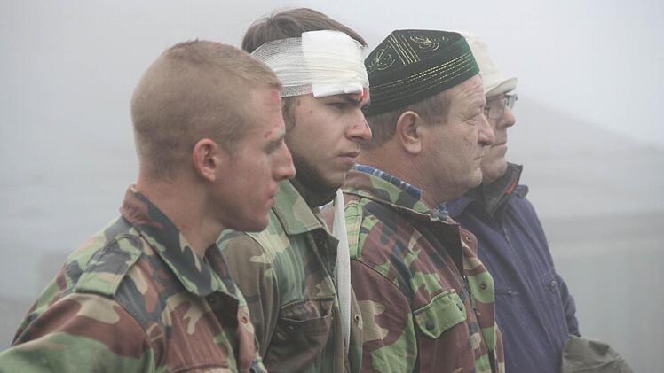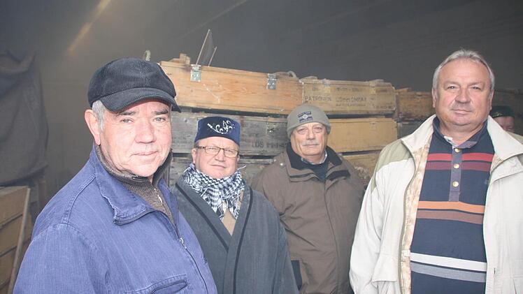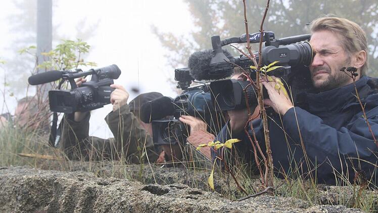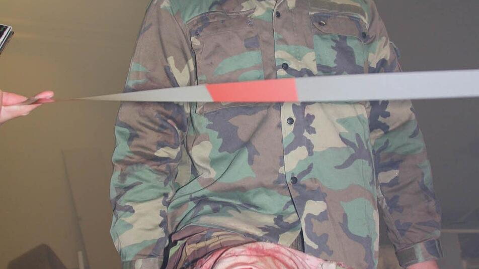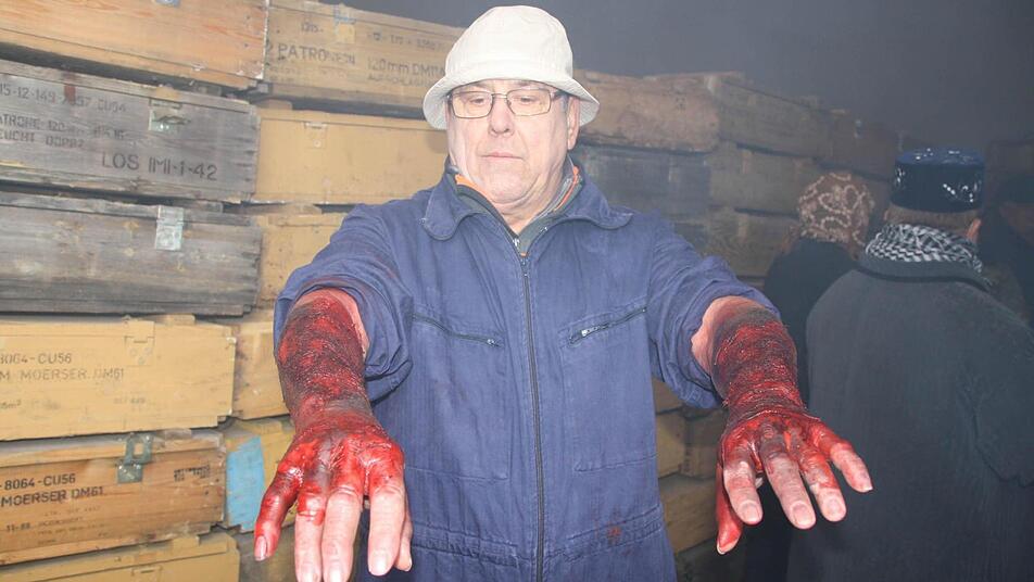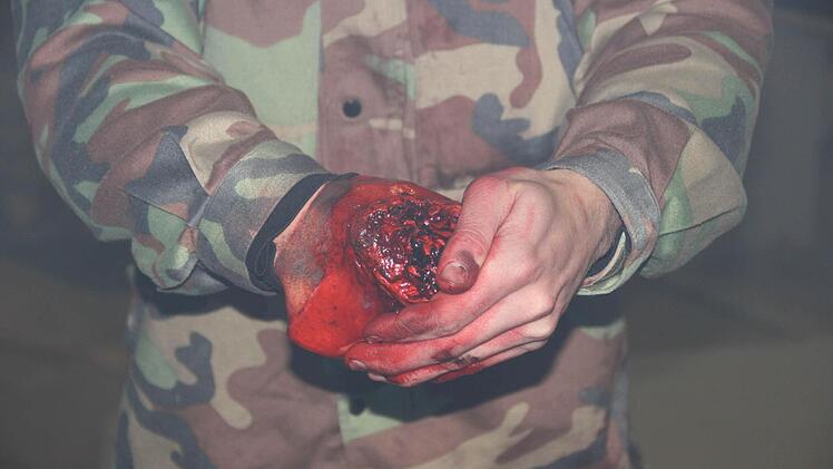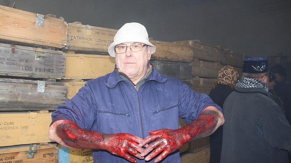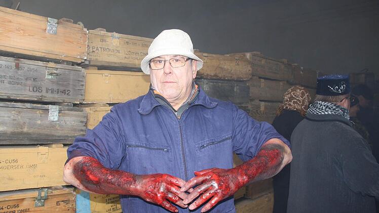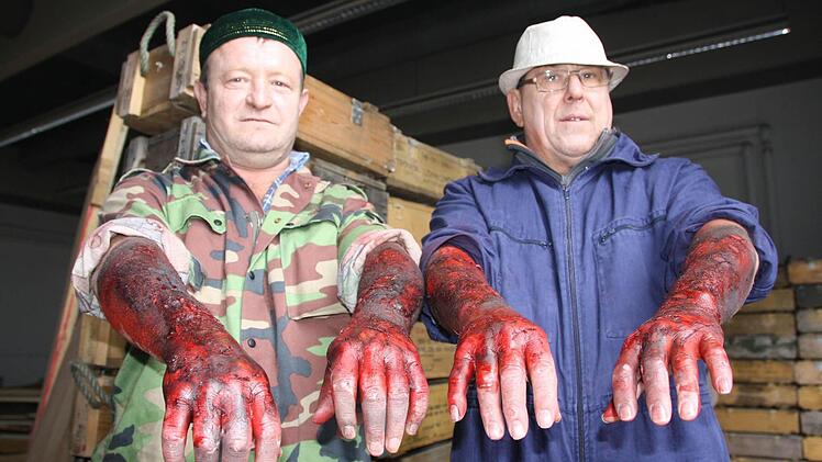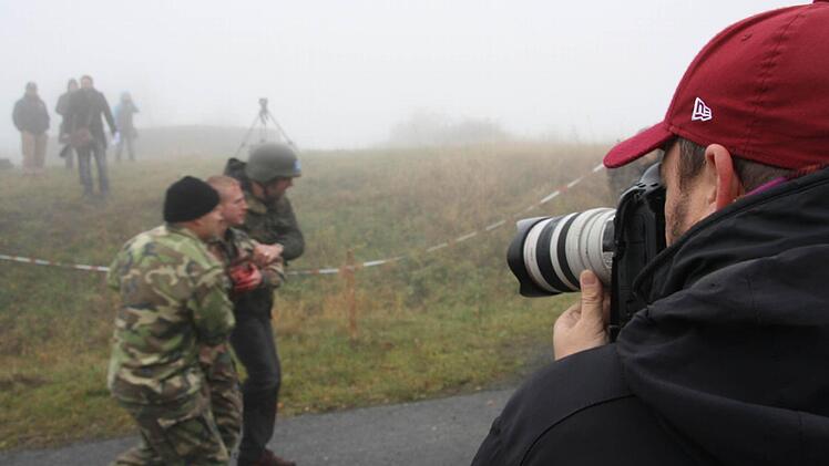 Soldat Patrick Bender hat eine echt aussehende Wunde an der Hand. Kurz vor dem Start hat er sie noch einmal mit roter Flüssigkeit eingesprüht, damit es noch realistischer wirkt. "Wir werden ab und zu eingeteilt", berichtet er über den Job als Komparse. Die meisten um ihn herum, sind allerdings Zivilisten, wie etwa Bernhard Maier aus Gersfeld. "Das Schminken dauert nur eine Viertelstunde", erzählt er. Zimperlich darf man nicht nur während der Szenen nicht sein, sondern auch beim Abschminken: "Da ist ein Kunststoff drunter, das zieht einem alle Haare raus", weiß er schon vorab.