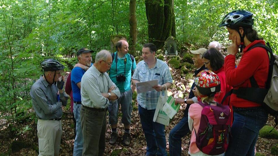 Ergänzt wurde der biologisch-geologische Aspekt heuer durch geschichtliche Informationen zur Weipertskirche. Heute völlig vergessen, ist der Ort, an dem einst eine Wallfahrtskirche stand, "ungeheuer alt", schilderte Matthias Elm. Im Jahr 1127 war erstmals ein Ort "Zum Hain" oder auch "Zum Hagen" erwähnt. Die Gemarkung umfasste circa 70 Hektar und lag an einer wichtigen Verbindung zwischen Fulda und Hammelburg. Der einstige Ort war laut Elm "keineswegs unbedeutend, sondern vergleichbar mit Schondra". Die Maße der Chorturmkirche von elf Metern Breite und 24 Metern Länge unterstreichen die Bedeutung des Ortes "Zum Hain".