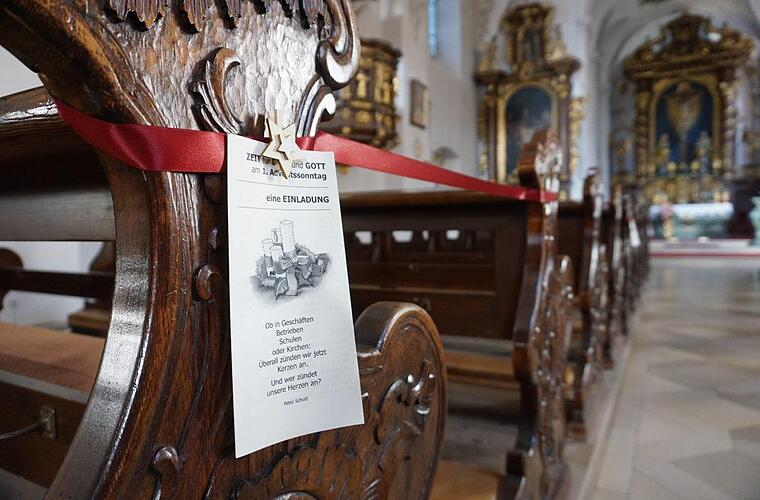 Denn nicht ausfallen braucht die Begegnung mit Gott. Die Kerzenkapelle und die Klosterkirche sind geöffnet. In der Kirche sind die bisherigen weiß-roten Absperrbänder deutlich ansprechenderen dunkelroten Stoffbändern gewichen. An diese sind mit kleinen adventlich anmutenden Sternenklammern Impulse geheftet, die passend zum Advent ausgewählt wurden. Sie können Begleiter oder auch Wegweiser zu Gott sein. Somit sind die Absperrbänder keine Absperrungen mehr, sondern Leitbänder auf dem Weg zu Gott und sich selbst.