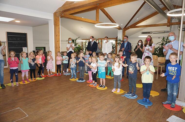 Auch Dieter Muth sprach voller Stolz und Zufriedenheit vom "Aushängeschild der Gemeinde". Sein Dank galt dem Kindergartenteam, Elternbeirat und Vorstand des Trägervereins für die kooperative und effektive Zusammenarbeit. Besonders dankte er der Schulleiterin Sabine Oschmann-Hockgeiger, dass der Kindergarten, während der langen Bauzeit, in der Schule ein Ausweichquartier beziehen konnte. Auch der Feuerwehr gelte Dank, sie stellten den Schulungsraum für den Kindergarten zur Verfügung. In Corona-Zeiten habe es sich als Vorteil erwiesen, in unterschiedlichen Gebäuden Kinder betreuen zu können, doch letztlich sei der Kindergartenbetrieb über drei Standorte hinweg eine Belastung gewesen.