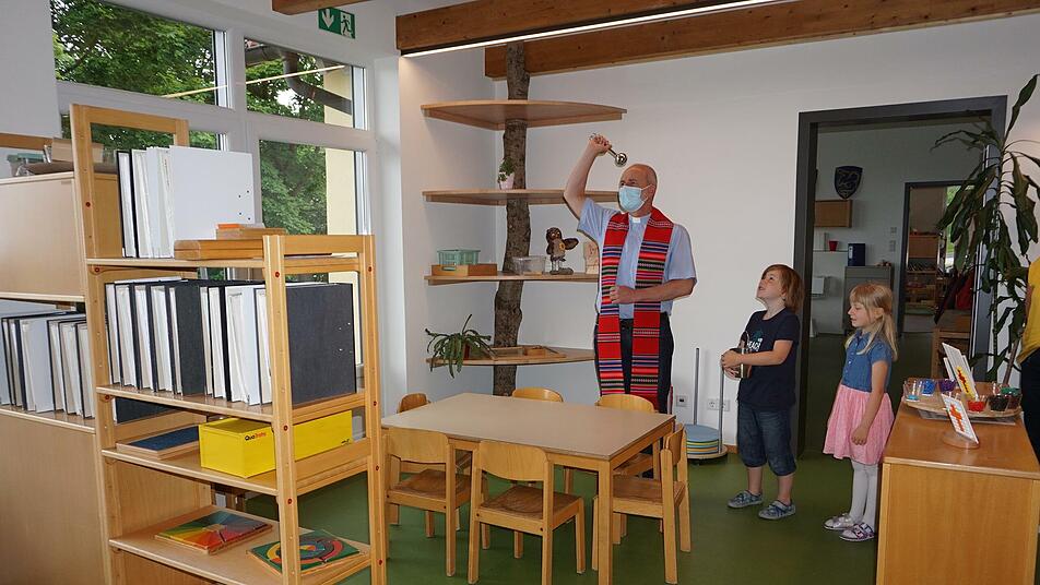 Pfarrer Armin Haas sieht den Kindergarten als ein Gemeinschaftsprojekt von Kirche und Gemeinde. "Es ist unser Kindergarten in unserem Dorf". Mit den Kindern komme Freude, Lebendigkeit und Farbe in die Gemeinde. Bei der Segnung der einzelnen Räume sprach Pfarrer Haas in jedem Raum ein kurzes Gebet, das individuell zum Zweck des Raumes passte. Ob Experimentierraum, Bibliothek, Bastelraum oder Kinderkrippe, Pfarrer Haas fand die richtige Worte. Letztlich gehe es darum, dass sich die Kinder in ihrem Kindergarten wohl- und geborgen fühlen, spielen, lachen, die Welt entdecken und Gutes erfahren. Und dass sie lernen, nach Ärger oder Streit wieder aufeinander zu zu gehen und sich zu versöhnen.