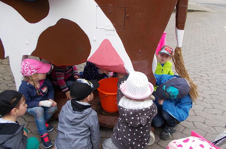 Das nächste Highlight folgte in Form einer Kuh aus Holz, deren Plastikeuter Wasser enthielt. Alle Kinder konnten selbst auszuprobieren, wie früher die Bauersleute ihre Kühe gemolken haben und das dies gar keine leichte Arbeit war. Auch das war wieder sehr anschaulich für die Kinder: Zwei Trinkwasserkästen mit circa 22 Flaschen zeigte die Menge an, die eine Kuh pro Tag an Milch liefert.