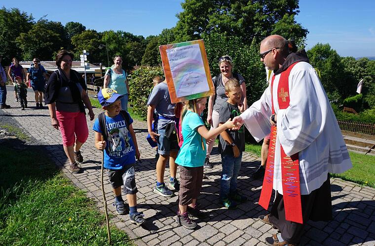 Pater Stanislaus ging den Kindern, ihren Eltern und Großeltern entgegen und begrüßte sie auf dem heiligen Berg der Franken. "Ihr habt euer Ziel erreicht. Wie bei den großen Wallfahrten läuten auch für euch die Glocken, und ihr werdet mit Weihwasser begrüßt", erklärte er den Kindern.Vor dem Freialtar lud Pater Stanislaus die Kinder und ihre Begleiter ein, innezuhalten und vor dem Kreuz zu beten. "Seit Jahrhunderten kommen die Menschen zum Kreuzberg unter das Kreuz." Den Wallfahrtssegen erteilte er mit dem Kreuz, in dem ein Kreuzreliquiar eingelassen ist.