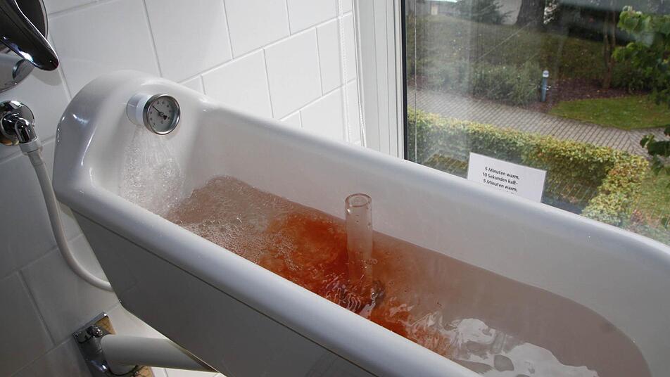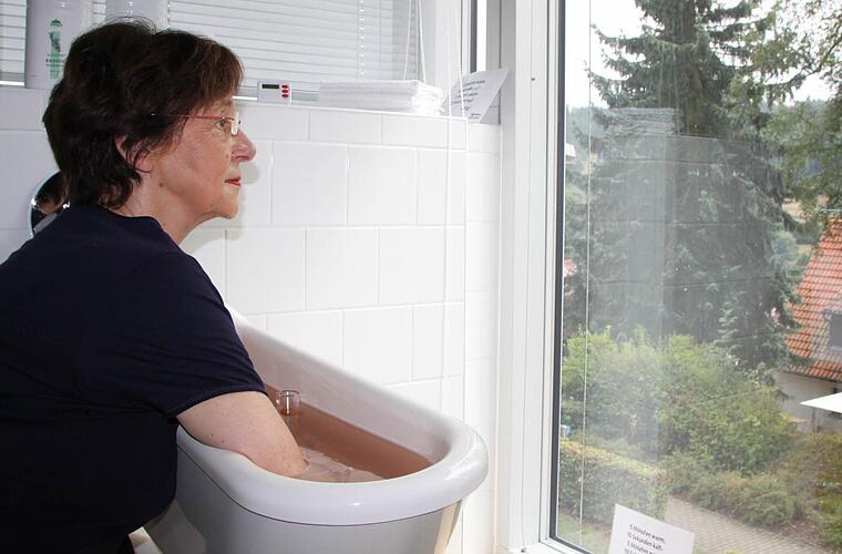 Still ist es im Behandlungsraum für Kneippanwendungen in der Malteser Klinik von Weckbecker in Bad Brückenau. Am Fenster sitzt Gudrun Besten, ihre Arme liegen in wohlig warmem Wasser. Das Wasser hat eine leicht rötliche Farbe. Ramona Simon hat etwas Rosmarin zugegeben, um die Anregung des Kreislaufs zu verstärken. "Bei Rheuma und Gelenkbeschwerden helfen warme Temperaturen", sagt sie. Zum Kneippen freilich gehört nicht nur der angenehme Teil, sondern auch der Kälte-Kick.