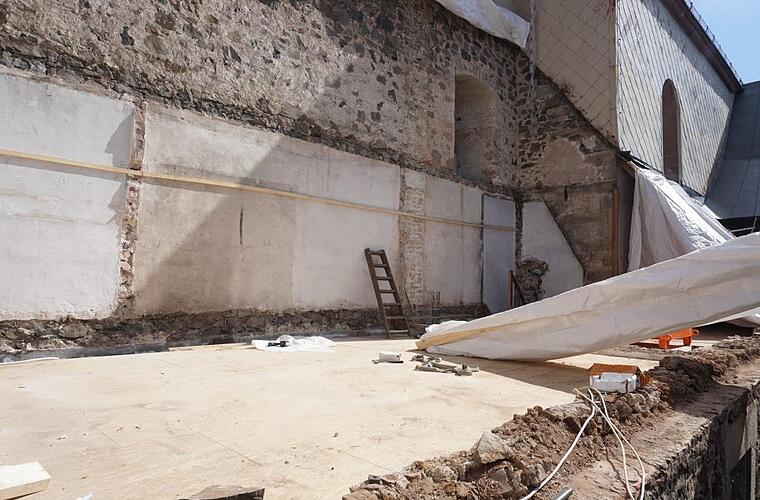 Für den Außenputz seien vom Denkmalamt eigens Mörtelproben am Bestand genommen worden. Die Analyse der Zusammensetzung sei Grundlage für den neuen Mörtel. "Die Ausbesserungen am Mauerwerk sollen mit einem möglichst originalgetreuen Material vorgenommen werden", sagte Enders.