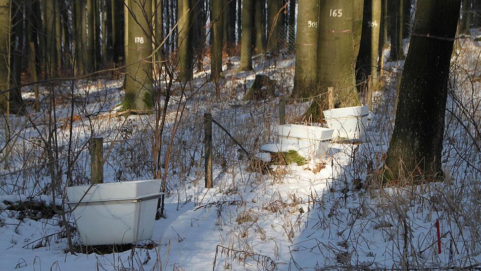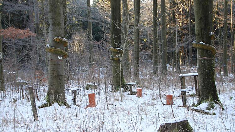 Vielzahl an Messstationen Ein Stück Wald, eingezäunt, mehr nicht - so ist der erste Eindruck von der Waldklimastation. Doch auf den zweiten Blick fallen die Nummern an den Bäumen auf und die Maßbänder um deren Stämme. Weiße Behälter sammeln die Streu, die von den Kronen fällt. Im Boden sind Behälter eingelassen, in denen das Sickerwasser aus dem Boden gesammelt wird. Gezielt steuert Kuno Rüttiger eine Hütte an. Er gibt Unterdruck auf die Saugkerzen, die die Feuchtigkeit des Bodens messen. "Da kann man rechtzeitig sehen, wann es knapp wird für die Bäume", erklärt Rüttiger.