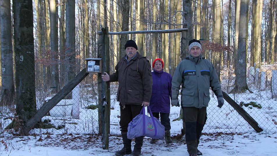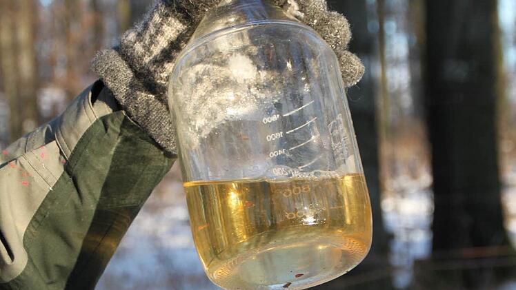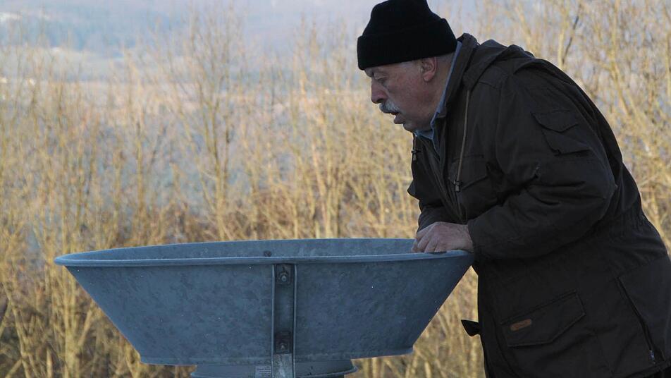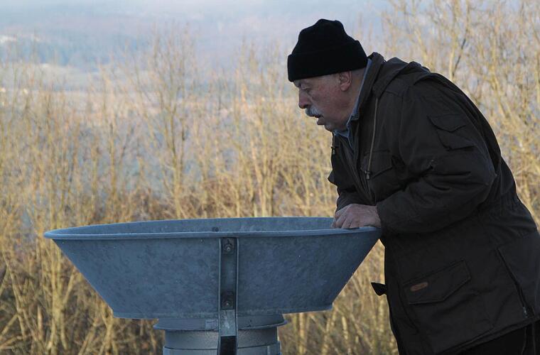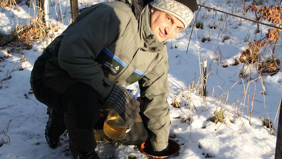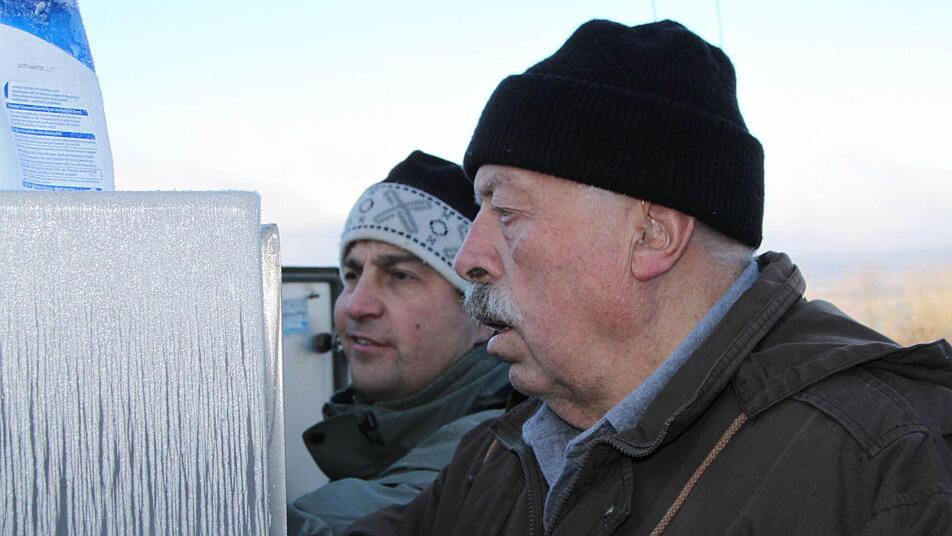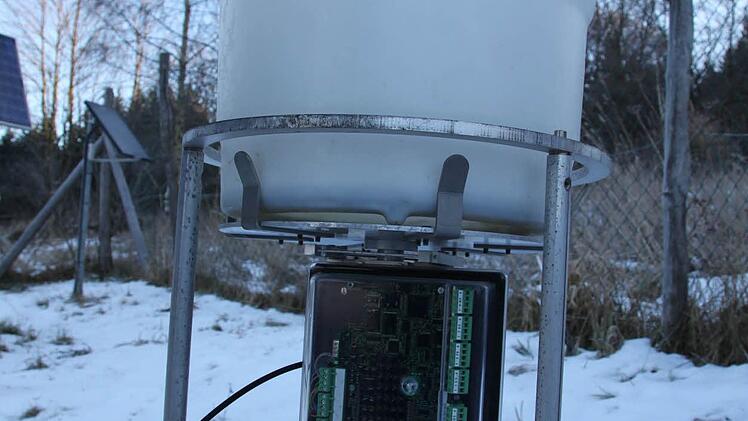 Es ist kalt in der Rhön, doch Kuno Rüttiger braucht keine Handschuhe. "Wenn man so lange im Wald war, ist man das gewöhnt", sagt Maria Rüttiger über ihren Mann. Er selbst steht an der elektronischen Niederschlagswaage. Ein Blick in den großen Trichter aus Metall zeigt: Noch ist kaum Schnee gefallen.