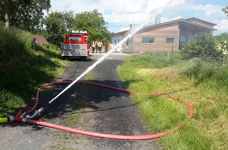 Inzwischen sind diverse Schlauchbrücken für die Querung von Straßen und Wegen platziert. Speziell eingeteilte Kameraden regeln mit Kelle und Handzeichen den Verkehr in der Ortsdurchfahrt. Parallel dazu richten andere Brandschützer die notwendige Saugstelle an der Sinn ein, von der aus das Wasser in Richtung Knottrain und dann weiter hinauf zum Aussiedlerhof gepumpt wird.