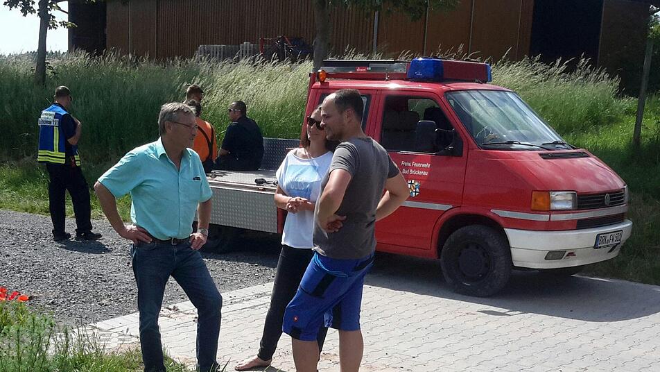 Der Zeitlofser Bürgermeister Wilhelm Friedrich (CSU) hat sich schon einmal zum "Brandherd" aufgemacht. Dort unterhält er sich mit Hendrik und Charlotte Kiefner. Das Ehepaar betreibt den Pferdehof mit einem Wohnhaus und mehreren Stallungen auf dem Hochplateau. Rund 80 Tiere obliegen ihrer Betreuung. Das Trio hat gerade seine Fachsimpelei beendet, als Bewegung in die Gruppe der männlichen und weiblichen Rettungskräfte kommt, die gespannt den Wassertransport verfolgt. Und dann spritzt auch schon das kühle Nass aus dem Strahlrohr, der Zweck der Übung ist erfüllt. Die Erleichterung darüber, dass diese komplexe Aufgabe mit der sehr langen Schlauchstrecke gelöst werden konnte, steht allen Beteiligten sprichwörtlich ins Gesicht geschrieben.