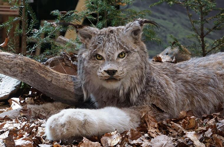 Wunderschöne Fotos lassen den Betrachter die Faszination dieser großen Katzenart hautnah erleben. Kurz gefasste Texte liefern alle wichtige Informationen rund um den Luchs. Ein präpariertes Exemplar ist der Mittelpunkt der Ausstellung. Zwischen Laub und Zweigen liegt der Luchs entspannt am Boden, als warte er nur auf neue Besucher.