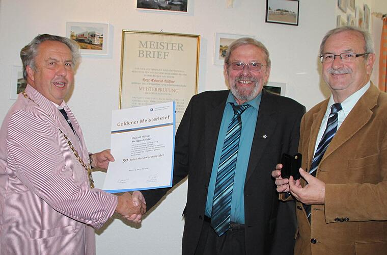 Oswald Hüfner aus Volkers erhielt den Goldenen Meisterbrief der Handwerkskammer für Unterfranken. "Es ist mir eine Ehre, die Urkunde überreichen zu dürfen", sagte Robert Schmitt, Obermeister der Metzgerinnung Bad Kissingen, schließlich "kommt das nicht oft vor". Winfried Schmitt, Geschäftsführer der Innung, hält auch schon die goldene Ehrennadel bereit. Oswald Hüfner freute sich über die Auszeichnung - auch wenn er schon lange nicht mehr als Metzger arbeitet.