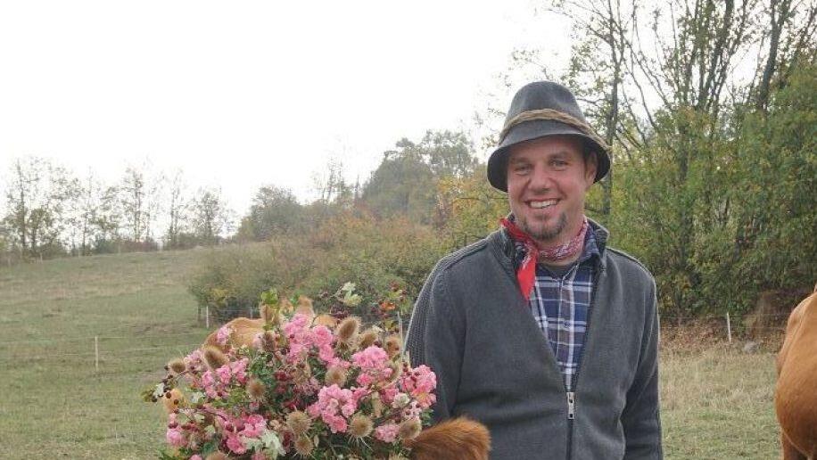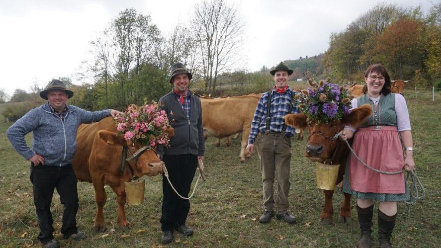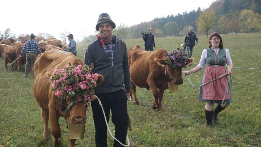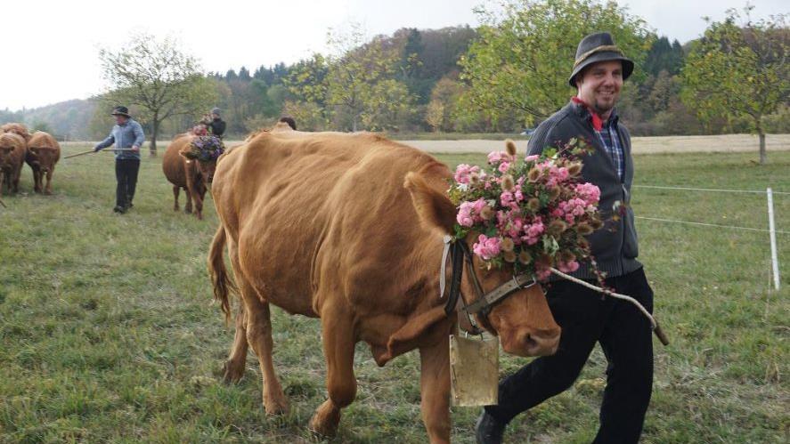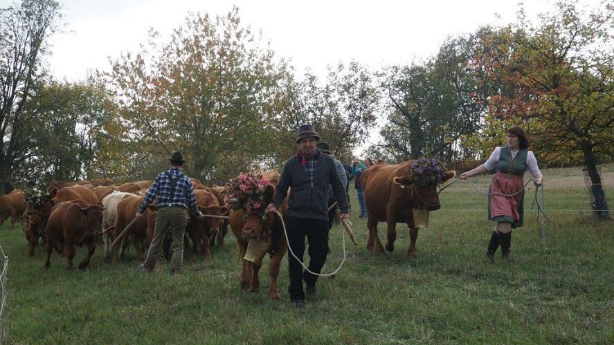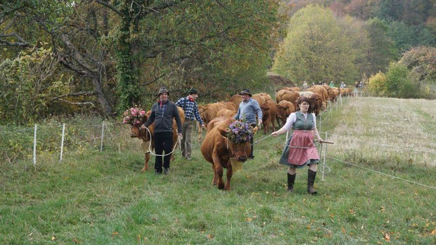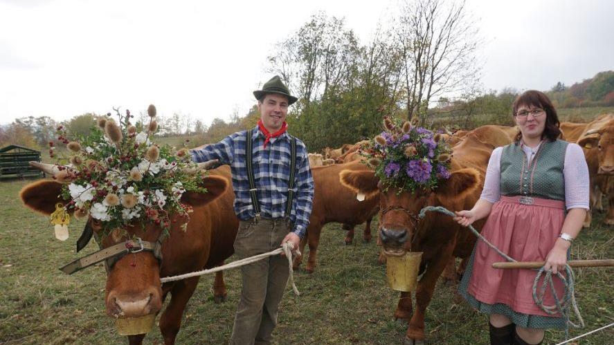 Ähnlich sportlich waren die 40 Rinder der Familie Manger unterwegs. Klaus und Nadine Manger züchten das alte fränkische Gelbvieh. Den Sommer über sind die Tiere mit ihren Kälbern auf der Weide. Da sie nicht regelmäßig gemolken werden, sondern die Kälber sich selbst bei ihren Müttern bedienen, sind die Tiere weder Führstrick noch Menschenansammlungen gewöhnt. Einzig Franziska ließ sich von Nadina Manger führen und Kuh Sandra von Andreas Omert. Kuh Emma hatte nur so lange still gehalten, um sich den Kopfschmuck anbringen zu lassen, aber führen lassen wollte sie sich nicht. Ebenso wenig wie die Leitkuh der Herde, die 16-jährige Mutti, die sich keinesfalls mit Halfter und Führstrick einfangen lässt. Geübt wurde mit den Rindern im Vorfeld des Weideabtriebs nicht. "Wir machen das live und in Farbe", schmunzelte Klaus Manger. Nadine Manger ist jedes Jahr froh, wenn nichts passiert und die Tiere heil im Tal ankommen. Schließlich sind die Rinder keine Schmusetiere, und dass sie scheuen und ausbrechen sei jederzeit möglich. Vor allem bei den Kälbern, die diese Prozedur ja nicht aus dem Vorjahr kennen. Doch es ging alles gut, mit wilden Sprüngen ging es ins Tal und nur Kuh Sandra und Franziska hatten die Ruhe weg, ließen sich willig führen und fürs Foto zurecht stellen.